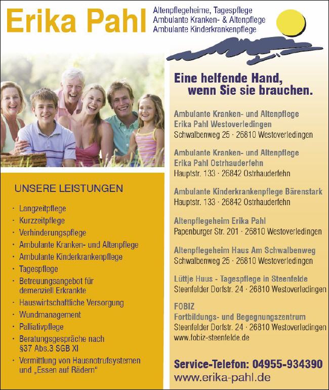 Seit mehr als 20 Jahren steht der Name „Erika Pahl“ für die qualifizierte pflegerische und medizinische Betreuung älterer und pflegebedürftiger Menschen in Westoverledingen, Rhauderfehn, Ostrhauderfehn, Papenburg und Umgebung. Unsere stationären Altenpflegeeinrichtungen „Erika Pahl“ und „Haus Am Schwalbenweg“ bieten 55 Bewohnerinnen und Bewohnern ein familiäres Zuhause.
